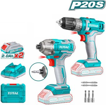 | - Дрель-шуруповерт TOTAL TDLI200528 - 1 шт.- Винтоверт TOTAL TIRLI2017 - 1 шт.- Аккумулятор 2 А*ч - 2 шт.- Зарядное устройство - 1 шт.- Биты - 2 шт.- Торцевые насадки - 3 шт.- Кейс - 1 шт.- Инструкция- Коробка | |